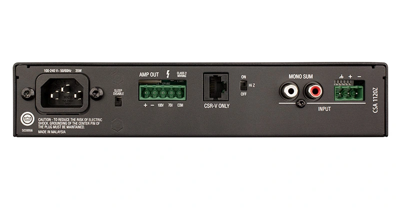 Ampli JBL CSA 1120Z cung cấp khả năng khuếch đại mạnh mẽ. Thiết bị sử dụng nguồn điện đa năng ở chế độ chuyển đổi và công nghệ DriveCore của Crown, mang lại âm thanh đáng tin cậy. Thiết bị hỗ trợ lắp đặt 70V và 100V, và chấp nhận điện áp AC từ 100 - 240 VAC, 50/60 Hz. Đồng thời, CSA 112 đáp ứng sáng kiến về môi trường GreenEdge của Harman, cho phép tiết kiệm năng lượng tối ưu. Thiết bị hỗ trợ cả cài đặt 70 và 100V ngoài hộp. Nó bao gồm 1x đầu nối RJ45 để sử dụng với bộ điều khiển âm lượng gắn tường CSR-V của công ty. Đầu vào được cung cấp bởi các đầu nối RCA đơn tổng và Euroblock. Đầu ra được cung cấp bởi các đầu nối Euroblock. Các nút bấm được chiếu sáng cung cấp phản hồi trực quan và nguồn điện phổ biến cho phép bộ khuếch đại chấp nhận điện áp AC từ 100 đến 240 VAC, 50/60 Hz. Bộ khuếch đại cũng đáp ứng sáng kiến về môi trường GreenEdge của HARMAN.