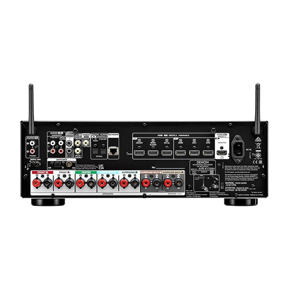 - AVR-X1700H 7.2 kênh có thể được định cấu hình để chạy hệ thống 5.1.2 Dolby Atmos hoặc DTS: X nhằm tái tạo âm thanh 3D cho các bố trí loa 7.1, 5.1 hoặc 2.1.