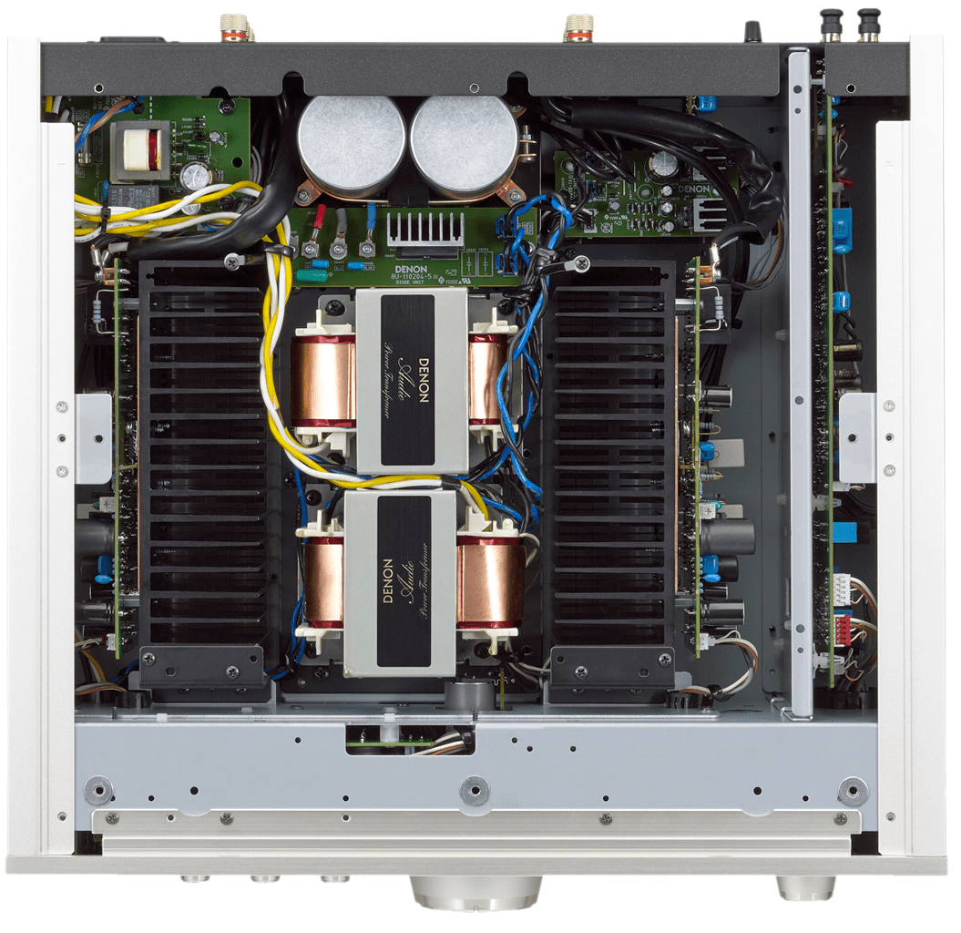 Điều ưu tiên hàng đầu đối với mỗi chiếc amply là vấn đề nguồn điện sạch. Với chiếc Amply DENON PMA 2500NE này, hai biến áp nguồn được trang bị riêng cho 2 mạch công suất độc lập. Đây là loại biến áp kiểu mới có trở kháng thấp đủ cung cấp những dòng điện lớn giúp cho việc xử lý được nhanh hơn và chuẩn hơn.