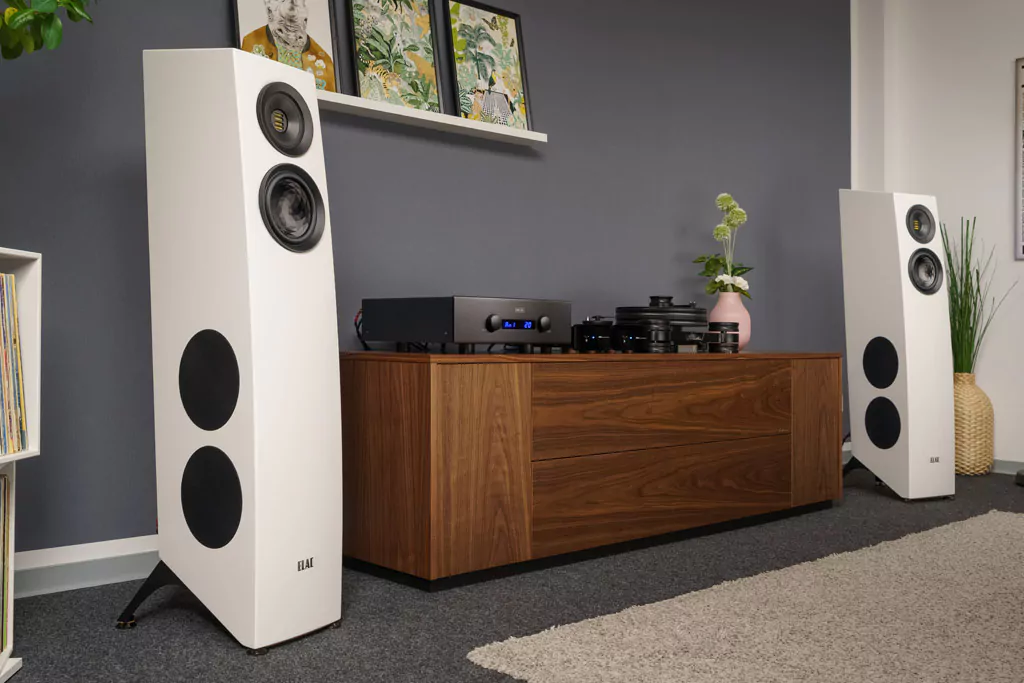ELAC Concentro S 509: chiếc loa có thiết kế đặc sắc và bộ tính năng ấn tượng. Vách ngăn bao quanh tạo thành nền tảng cho những màn trình diễn âm thanh tuyệt vời. Kết hợp với tủ có góc cạnh nhẹ nhàng, hình thang cơ bản và cụm đáy biểu cảm, hoàn chỉnh với hiệu ứng 'gót cao', kết quả là vẻ ngoài mạnh mẽ nhưng tự nhiên và thanh lịch. Ngoại thất của nó là sự cộng sinh hoàn hảo giữa thiết kế sang trọng của Concentro và những đường nét gọn gàng của Dòng VELA. Hình dạng cơ bản hình thang, vách ngăn bao quanh và tủ có góc cạnh nhẹ nhàng kết hợp với nhau để truyền tải vẻ ngoài tự nhiên, đơn giản. Cụm đáy nổi bật đạt được hiệu ứng 'cao gót', mang lại cảm giác sang trọng và ổn định. Ngẫu nhiên, nó cũng đảm bảo một nền tảng vững chắc đặc biệt.