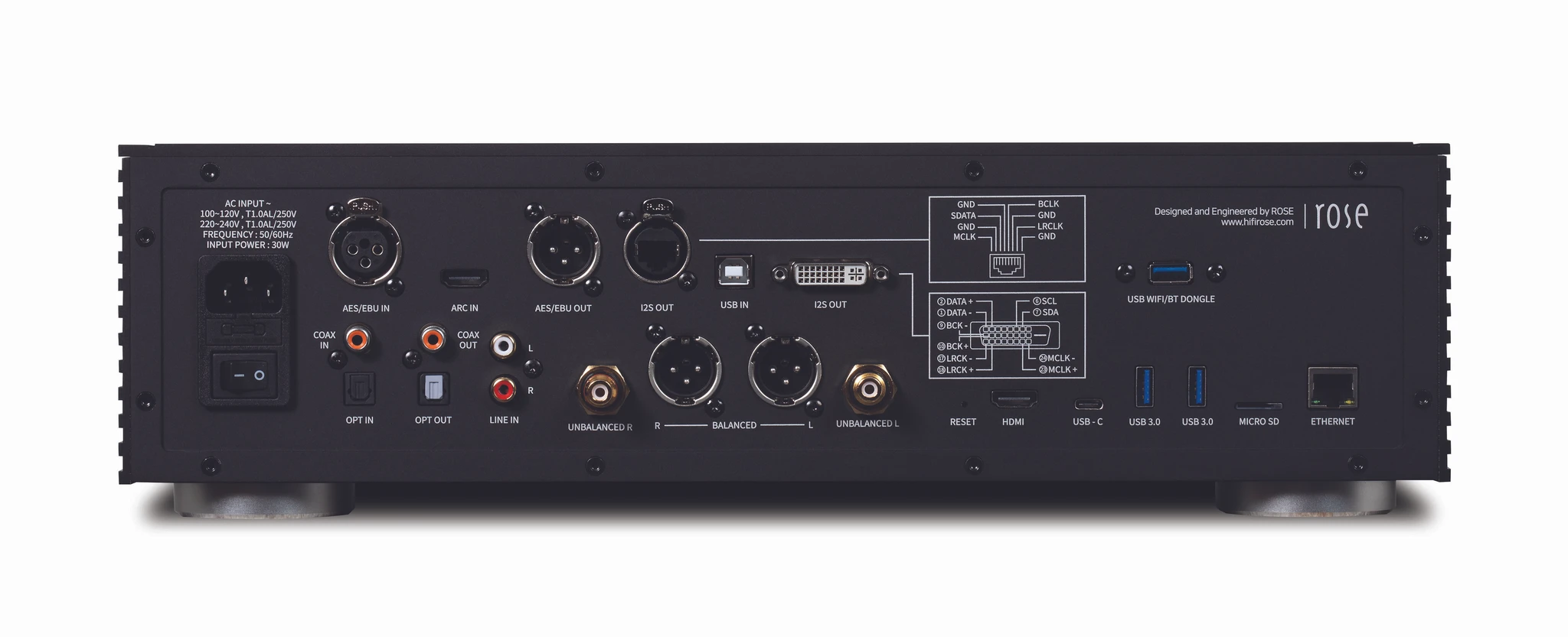 RS150 lại là một chiếc network streamer thuần túy với khung máy lớn hơn, trang bị CPU 6 nhân và chip đồ họa Mali-T864. Tuy nhiên, quan trọng nhất chính là sự xuất hiện của chip DAC tham chiếu ES9038PRO, hứa hẹn đem tới âm thanh trung thực, có độ chính xác cao và rất giàu chi tiết. RS150B có thiết kế vỏ nhôm khối, đảm bảo việc chống rung tối ưu, phần nguồn cũng được hãng rất chú trọng khi trang bị biến thế xuyến lớn cùng hệ thống tụ lọc lớn. Bên trong RS150B còn được trang bị chip DAC tham chiếu ES9038PRO giảm độ ồn, độ méo tiếng xuống mức thấp nhất và tạo ra âm thanh có độ phân giải cao, hỗ trợ ngõ ra balance. HiFi Rose RS150B hỗ trợ giải mã PCM 32bit/768KHz và DSD 512 (native).