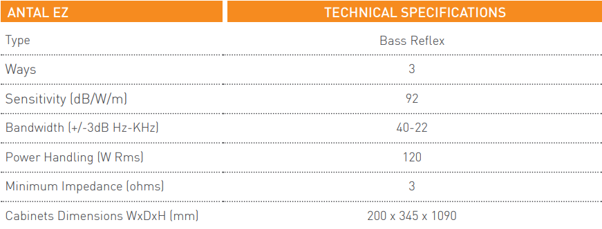 Antal Ez đánh dấu sự xuất hiện của công nghệ chủ chốt, màng chắn cellulose 100% tự nhiên dành cho củ loa tầm trung. Loại giấy tự nhiên không qua xử lý hóa học này là sự kết hợp hoàn hảo giữa độ nhẹ và độ cứng để tái tạo âm sắc và giọng nói rất tự nhiên. Cuối cùng, hai loa trầm bằng sợi thủy tinh mang đến âm trầm sâu và mạnh mẽ. Antal Ez có một bệ thủy tinh trang nhã để tạo sự ổn định với các gai cao su và kim loại để tách rời loa của bạn. Nó sẽ thu hút bất kỳ ai đang tìm kiếm một chiếc loa hiện đại, sống động sử dụng công nghệ chính của TRIANGLE. Thích hợp cho phòng có diện tích từ 20 đến 40m2.