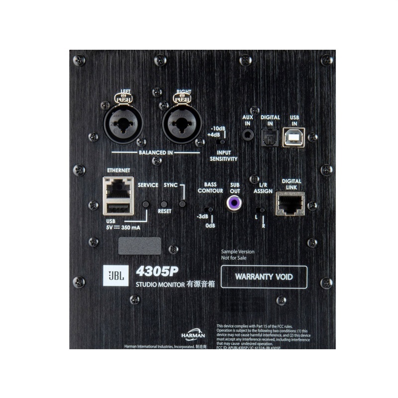 Phần kết nối của loa không dây JBL 4305P được chăm chút rất kỹ lưỡng, bằng việc trang bị đầy đủ mọi giao thức tín hiệu cần thiết, từ không dây cho đến có dây, giúp loa tương thích tốt với mội loại nguồn nhạc. Đôi loa này sở hữu kết nối Ethernet, Google Chromecast built-in, Apple AirPlay 2, Bluetooth, USB Type-B, Optical Digital và 3.5mm. Khi nhận thấy từng ấy kết nối vẫn chưa đủ khiến JBL 4305P đủ linh hoạt, nhà sản xuất còn bổ sung thêm các cổng XLR/ 1⁄4-inch TRS phono và một núm xoay chỉnh độ nhạy đầu vào tuỳ theo tín hiệu balanced hoặc unbalanced. Do đó, JBL 4305P không chỉ là đôi loa dùng để nghe nhạc giải trí mà còn có thể sử dụng để làm các công việc xử lý âm thanh, sáng tạo âm nhạc, như các loa phòng thu chuyên dụng dành cho giới chuyên nghiệp và các nghệ sĩ.