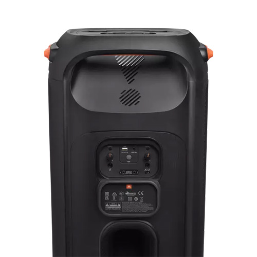 Ngoài ra, một điểm nhấn trong thiết kế chiếc loa PartyBox 710 này hệ thống 4 thanh đỡ cao su màu cam ở 2 mặt cạnh loa, giúp loa có thể đặt dọc hoặc ngang tùy theo địa hình trình diễn. Kết hợp với thiết kế các gờ nhỏ chạy song song 2 bên mặt loa và logo chấm than làm chiếc loa trở nên đẹp mắt hơn trong mắt người dùng.