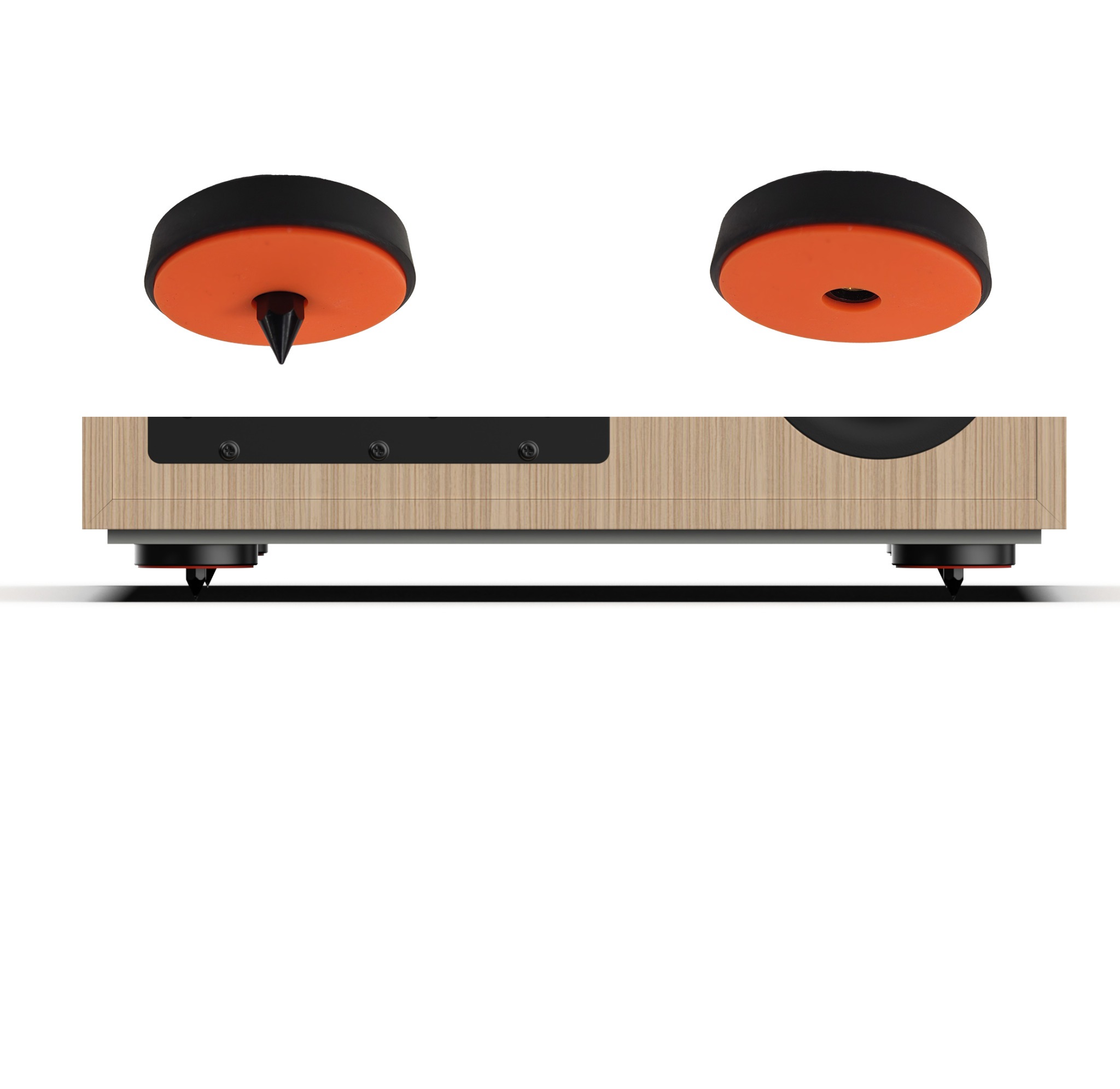 Chân đế có thể điều chỉnh: Chân đế có đinh nhọn giúp loa ổn định khi đặt trên thảm dày hoặc mềm. Các đinh nhọn này có thể vặn vào từng chân đế của loa và dễ dàng điều chỉnh từ phía trên.