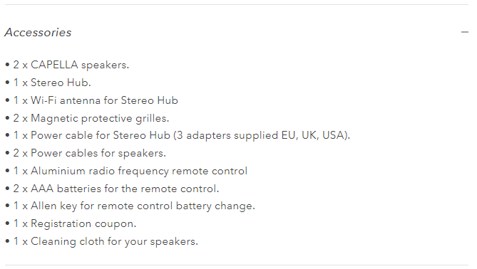 Hệ thống CAPELLA sử dụng công nghệ truyền âm thanh không dây WiSA nên bạn có thể đặt loa ở bất cứ đâu trong nhà mình. Mọi nguồn âm thanh, cho dù từ dịch vụ phát trực tuyến hay được kết nối với một trong các đầu vào của hệ thống, đều được quản lý bởi hộp WiSA có tên là “Stereo Hub” , sau đó truyền tín hiệu đến loa có độ phân giải cao mà không có độ trễ đáng chú ý. Điều này có nghĩa là bạn có thể đặt Stereo Hub gần thiết bị AV của mình (TV, bàn xoay, máy tính, v.v.) và tự do đặt loa xung quanh phòng.