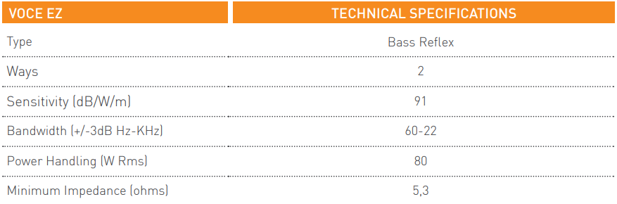 Thiết lập này hoàn toàn phù hợp cho việc thiết lập rạp chiếu phim. Loa tweeter dạng còi mang lại hiệu quả cho loa và phích cắm pha nằm bên trong loa tweeter đảm bảo phân tán tốt các tần số cao khắp phòng. Màng loa giấy tự nhiên hoàn hảo để tái tạo âm sắc giọng nói của con người để mang lại độ chân thực cao hơn. Voce Ez có cấu hình phản xạ âm trầm với hai cổng ở phía trước thùng loa để mở rộng đáp ứng tần số thấp hơn và tạo điều kiện thuận lợi cho việc định vị loa trong phòng.