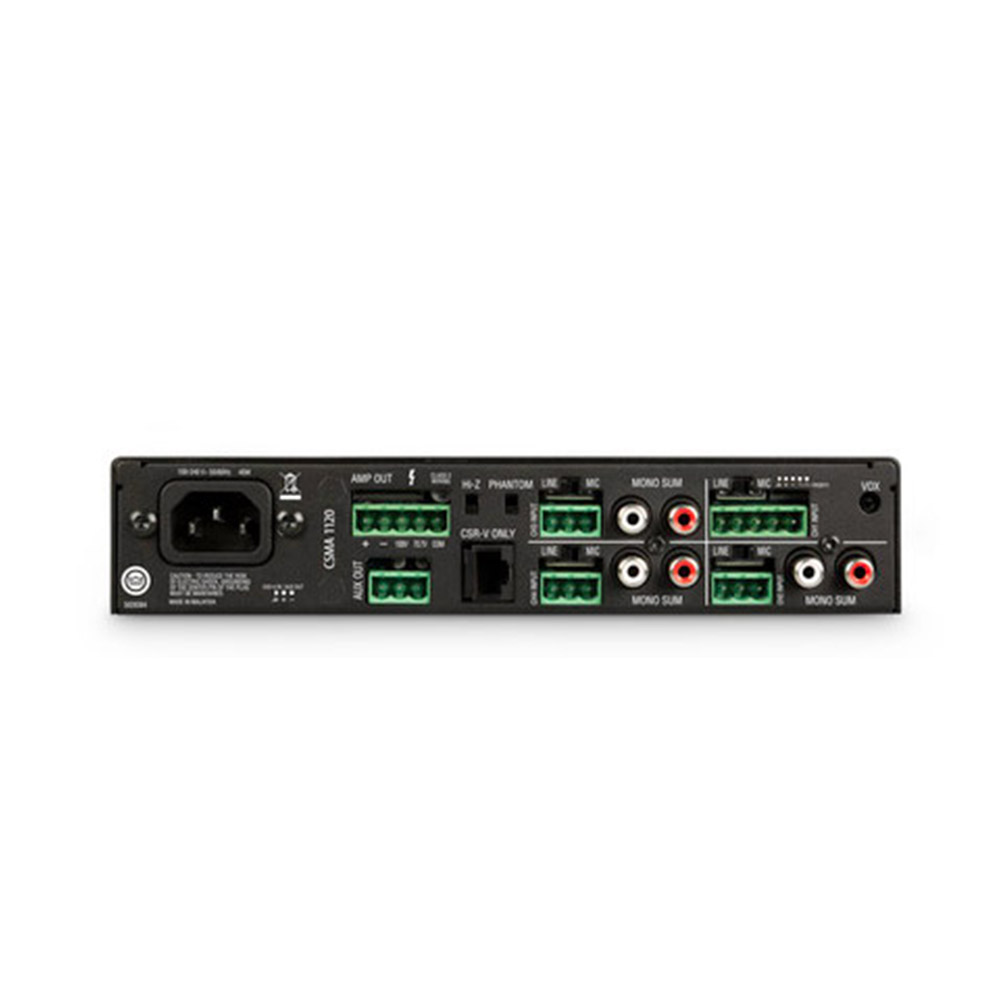 Bộ trộn / amps CSMA cung cấp khả năng sử dụng dễ dàng chưa từng có, với mặt trước sạch sẽ chỉ có các nút điều chỉnh âm lượng cho từng kênh, điều chỉnh âm lượng chính, điều chỉnh âm trầm và âm bổng có thể điều chỉnh và công tắc nguồn. Tất cả các nút điều khiển âm lượng được bao quanh bởi một vòng chiếu sáng, giúp chúng dễ dàng nhìn thấy và hoạt động trong môi trường tối. Bộ khuếch đại có thể truyền tải 8 ohm và 4 ohm và có thể được sử dụng với hệ thống âm thanh phân phối 70V và 100V mà không cần biến áp riêng. Ngoài đầu vào micrô / đường truyền cân bằng, đầu vào RCA không cân bằng và kết nối loa, tất cả các thiết bị đều bao gồm đầu nối RJ45 để sử dụng với bộ điều khiển âm lượng âm tường JBL CSR-V. Tất cả các mẫu đều có nguồn điện phổ thông cho phép khả năng chấp nhận điện áp xoay chiều từ 100 đến 240 VAC, 50 / 60Hz.