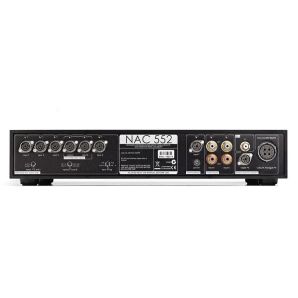 Về mặt kết nối, chiếc pre-amp này hỗ có tổng cộng tới 9 đầu vào tín hiệu, gồm 2 RCA và 7 DIN 5-pin, cho phép người dùng có thể kết phối ghép đồng thời nhiều nguồn phát cùng lúc, lựa chọn và chuyển đổi đầu vào tín hiệu dễ dàng bằng điều khiển từ xa hoặc bảng điều khiển phía trước máy. Trong khi đó, ở phần đầu ra, Naim NAC 552 hỗ trợ 1 tùy chọn variable (có volume) và 3 tùy chọn fixed (không can thiệp volume).