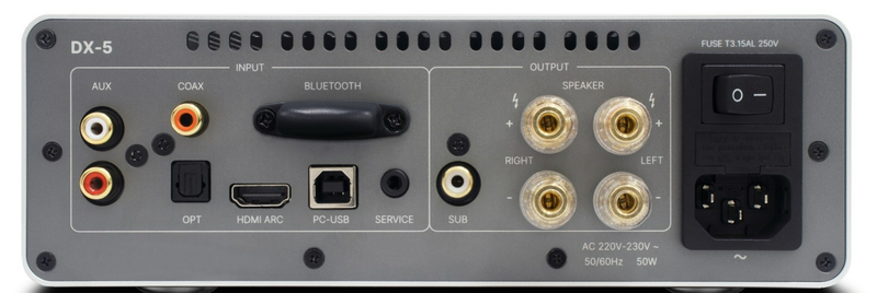Ngoài việc tương thích với nhiều định dạng âm thanh số, DX-5 còn cho phép kết nối linh hoạt với các thiết bị khác thông qua cổng HDMI ARC để đồng bộ với TV, hỗ trợ truyền tín hiệu qua USB, cổng đồng trục và quang học, cũng như kết nối không dây qua Bluetooth chuẩn aptX HD và AAC. Người dùng có thể sử dụng đầu vào RCA truyền thống nếu thích chất âm analog. Thiết bị cũng hỗ trợ jack tai nghe 3.5mm cho nhu cầu nghe riêng tư và có thể ghép nối với loa siêu trầm để tạo nên hệ thống âm thanh 2.1 sống động ngay tại không gian làm việc.
