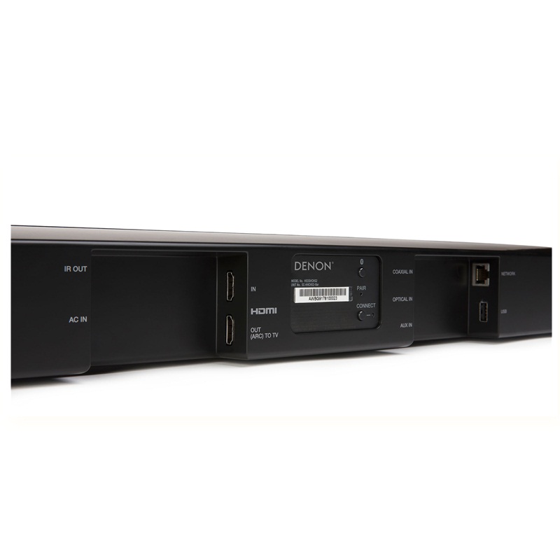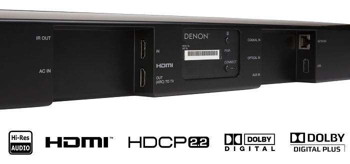 Phía sau loa thanh có đầy đủ các ngõ kết nối thông dụng hiện nay. Ngõ vào HDMI cho nguồn phim 4K Dolby Vision và HDR10 tiêu chuẩn HDCP 2.2. Ngõ ra HDMI (ARC) tiện dụng truyền luôn âm thanh từ TV xuống. Ngõ vào Analog jack 3.5mm, ngõ vào Optical và Coaxial cho tín hiệu Digital. Cổng cắm dây mạng LAN kết nối Internet. Đặc biệt, Denon DHT-S516H có cổng USB dùng cắm và phát nhạc Lossless Hi-Res Audio từ ổ cứng rất hay cho các tín đồ nhạc số dùng HEOS App điều khiển.