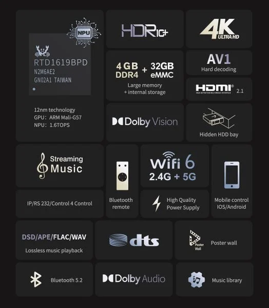 * Chip: RTD1619BPD, Bộ xử lý lõi tứ 64bit hiệu năng cao.